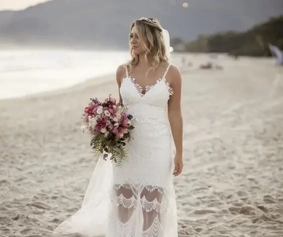 Uma dica legal também é investir em um estilo boho para o vestido de noiva simples praia, para trazer ainda mais esse ar leve e natural ao casamento.